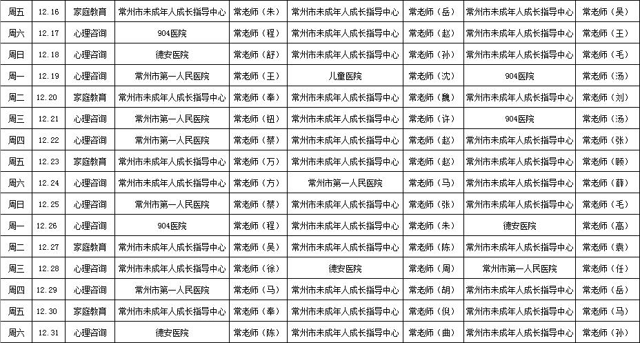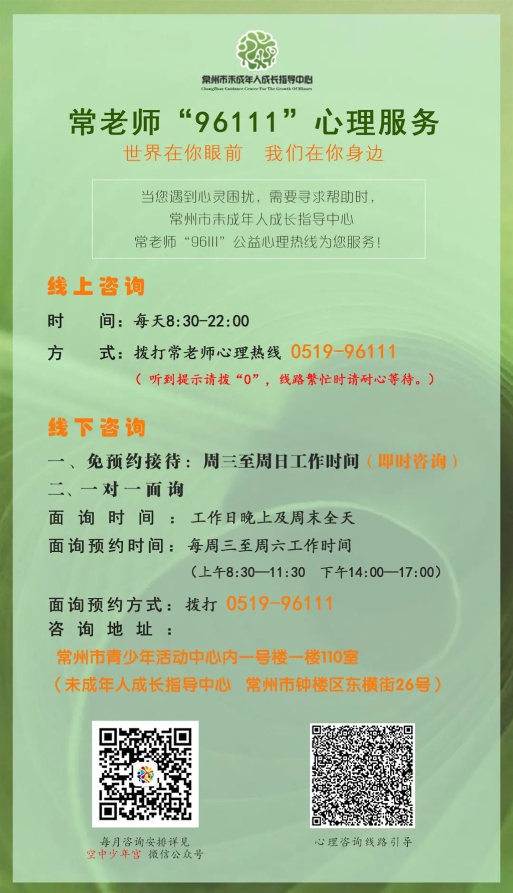 气温骤降, 冬日的感觉也越来越真切了。 2022年即将结束, 各位小朋友大朋友们的目标和愿望都实现了吗? 如果你遇到了困难, 感到学习压力大, 不知如何释放, 或是情绪莫名烦躁, 不知向谁倾诉 …… 常州市未成年人成长指导中心提供常老师96111公益心理热线和面询服务,时刻守护您的心理健康,同学和家长们可以选择合适的时间及方式进行心理咨询! 也可根据需要拨打各辖市(区)未成年人成长指导中心及医院心理科咨询电话。 公益心理咨询安排 96111电话咨询安排 时间 每天8:30-22:00(18:00-22:00为专家在线值班) 方式 拨打常老师心理热线“0519-96111” (拨通电话听到提示后一定要按“0”哦!若拨打电话过程中显示正忙或者无人接听,表示该时间段内咨询师正在接待咨询,请稍等片刻重新拨打。) 面询安排 (一)工作日免预约接待 1.咨询时间:周一至周五(8:30—11:30,14:00—17:00) 2.咨询方式:无需预约,现场专家接待 3.咨询对象:家长或学生 (二)一对一预约面询 1.预约时间:每周三至周六工作时间(8:30—11:30,14:00—17:00) 2.预约方式:拨打“0519-96111”或“0519-86617789” 3.线下咨询时间:工作日晚上及周末全天 (备注:每次咨询50分钟左右,时间和咨询师更加固定。) 线下咨询地址 常州市青少年活动中心内一号楼1楼110室 (未成年人成长指导中心,常州市钟楼区东横街26号) 温馨提示 根据疫情防控要求,近期线下咨询时请配合信息登记、测温,扫描场所码,并提供72小时内核酸阴性报告。 空中少年宫 17 12月常老师心理热线 (0519-96111)值班安排 各辖市(区)未成年人成长指导中心 热线电话 关于危机干预求助 心灵的困扰一定要及时排解 你说,我听 无论何时无论何地 常州市未成年人成长指导中心 永远在您身边!